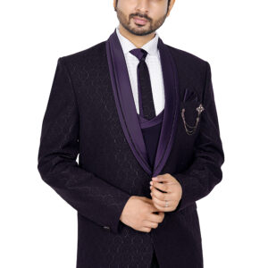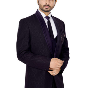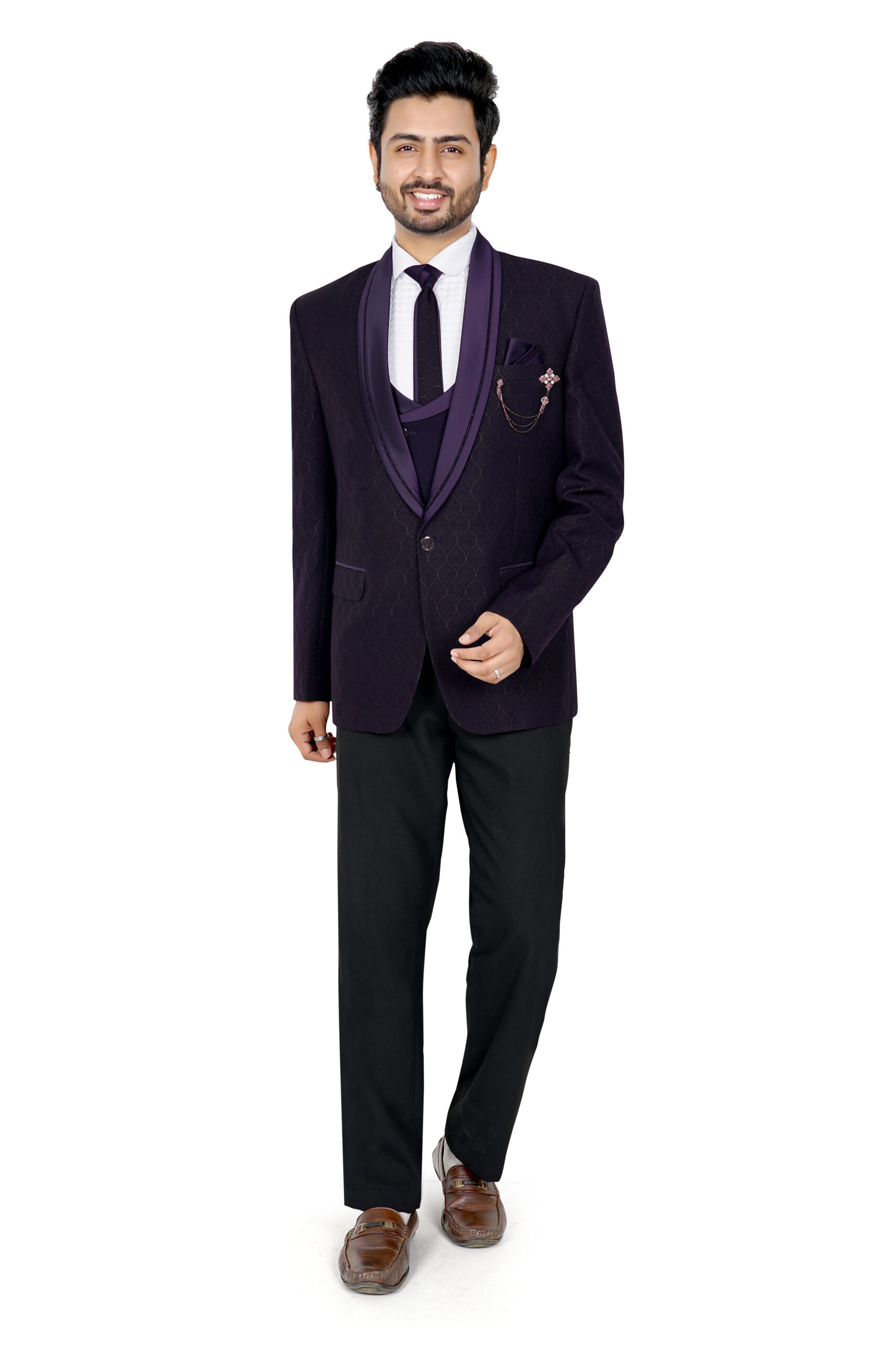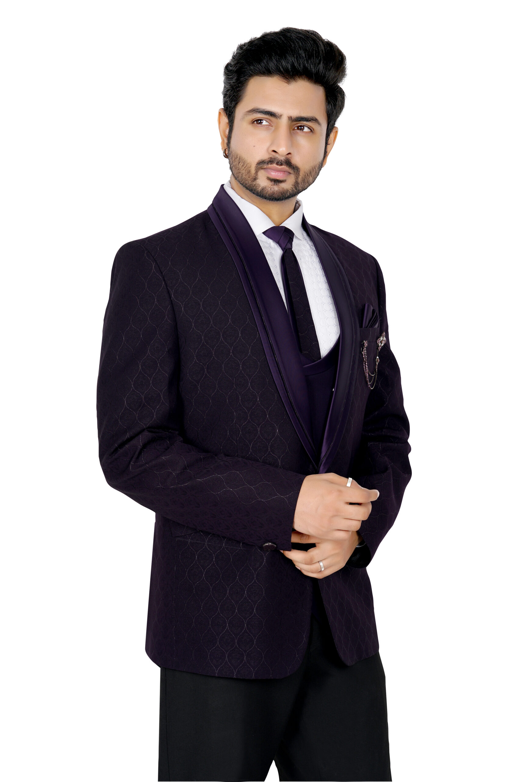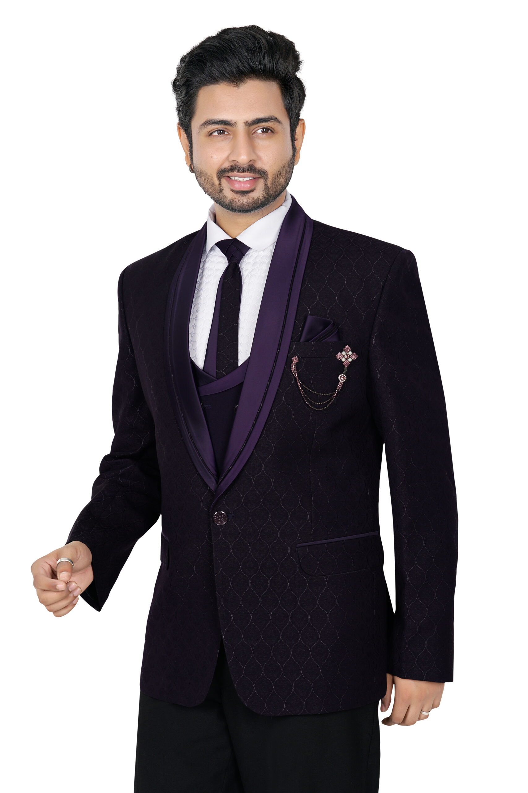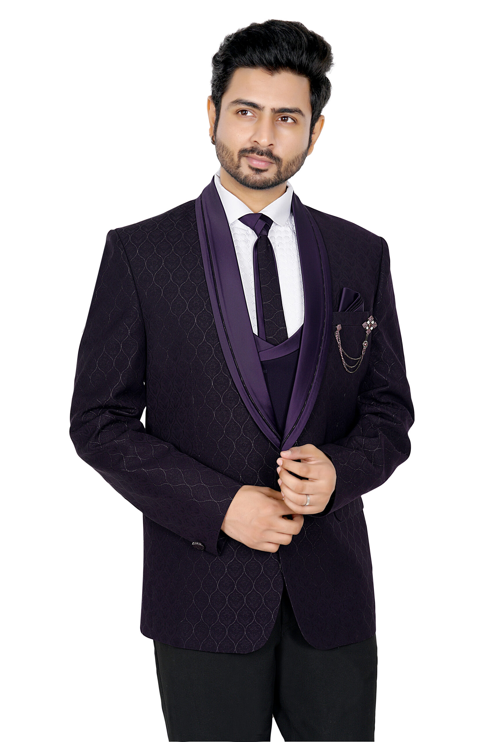 A standout feature is the decorative brooch with chain detailing on the chest pocket, paired with a neatly folded pocket square for an added touch of luxury. Designed for weddings, festive occasions, and formal celebrations, this sherwani jacket offers both comfort and style.